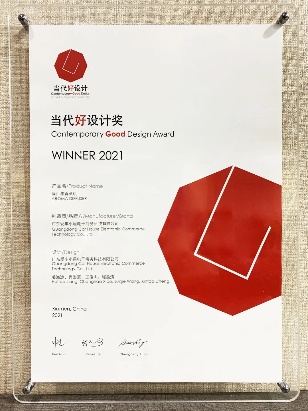 不僅如此,在2021年12月14日,香百年智能香薰機憑借獨特亮眼的設計,從數千件產品中脫穎而出,斬獲“2021當代好設計獎”。